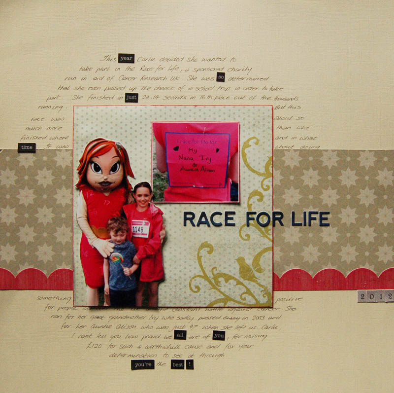and for my second layout I wanted to acknowledge my granddaughters acheivements when she recently took part in the ‘Race for Life’