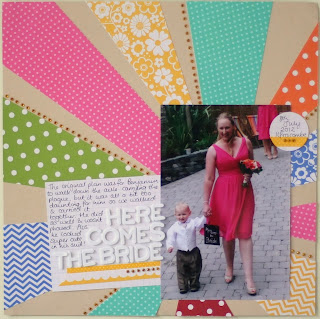 My last page for today was inspired by the page I created and taught at last year’s scrapbooking retreat. It features s sunburst effect, and one of my favourite photos from my sister’s wedding. Benjamin was pageboy and looked so adorable in his little suit! He carried a little plaque down the aisle which said “here comes the bride”, and was completely unfazed by 70 odd people watching him.