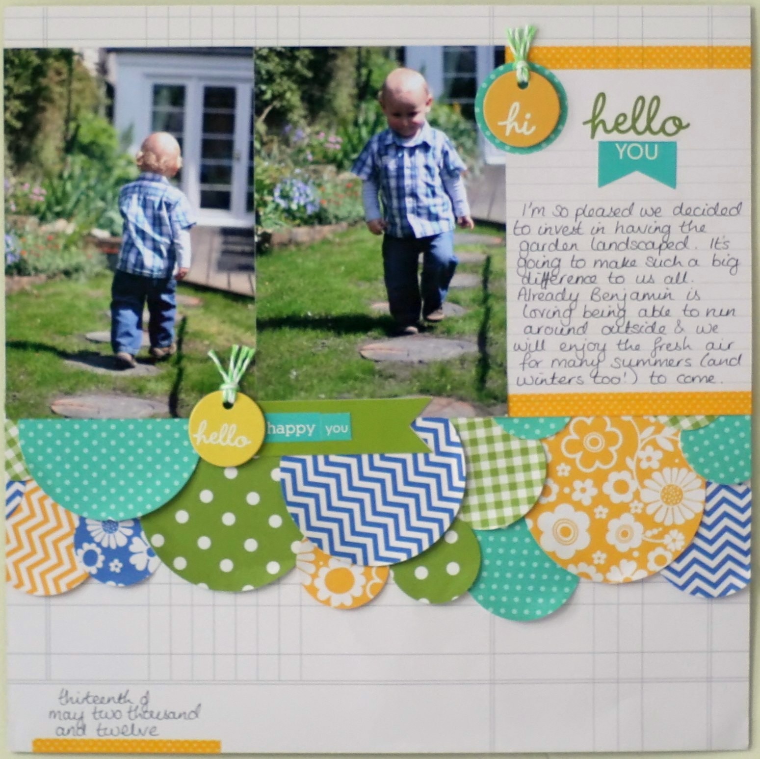 For this next page I chose a more select set of colours from the palette, to compliment the photos of my little boy enjoying our garden after it was landscaped. We had it converted from gravel and waist height raised beds to a lawn, and he just loves it! I punched lots of various sized circles from the papers and arranged them under my photo strip, raising the bottom edges up on foam squares to give some depth.