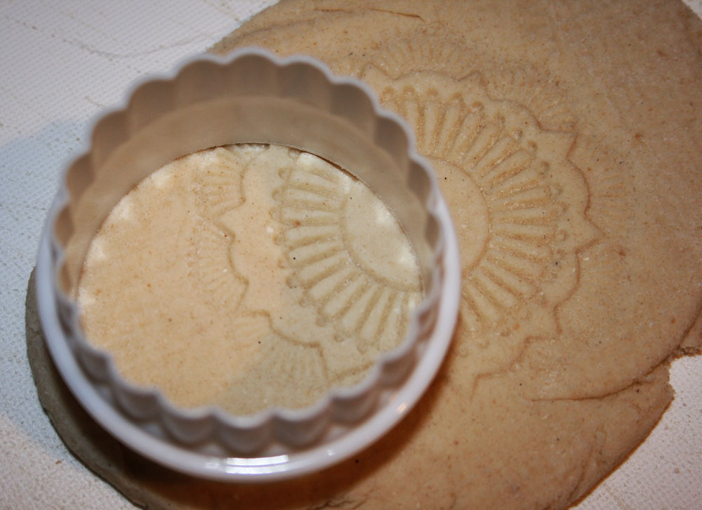 Working on the textured side, I used a pretty doily stamp to add some decorative detail to my dough, pressing hard enough to get a good imprint, but not so hard that it would flatten the waffle texture from the hessian.