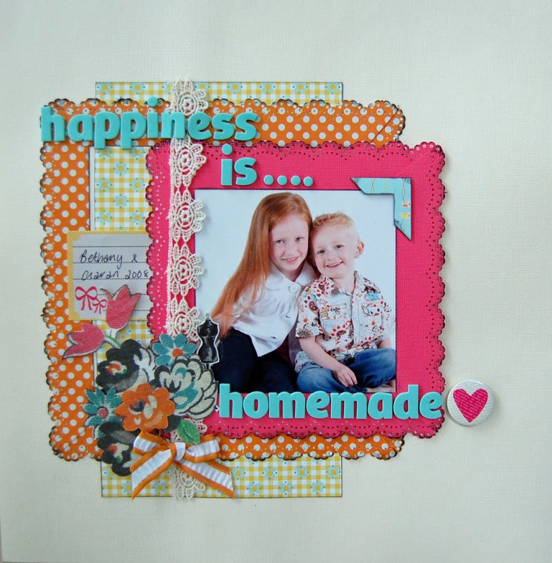“A very rare cute picture of my two together!! the colours in my sons shirt matched perfectly with these papers. I decided to make some frames for this page, to make mine I border punched some strips of card and paper and cut the ends at an angle so i could fit them altogether. I layered up my frames using foam pads. I love the cute ruffled orange ribbon and just had to make a bow for my page, I just cant seem to resist bows at the minute.”