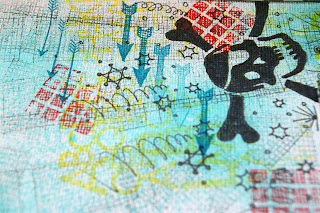 I used a yellow ink pad and stamped the Studio Calico alphabet background over the doodled images. This gives a very subtle, barely there effect, which I really like. I also stamped a red block design in a few places, only lightly pressing on so the stamped image was patchy.