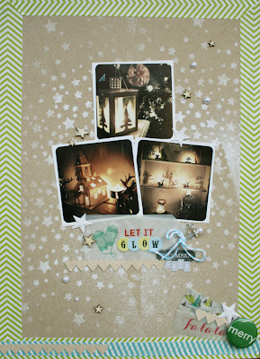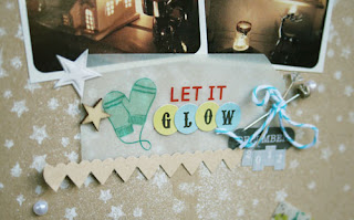 For my title, I altered the “Let it Snow”vellum tag to “Glow” using some of the stickers on the second Echo Park Photo Freedom stickers sheet I used in November. I kept the embellishment simple, allowing the photos and the misted background to be the focal point.