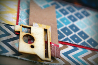 After splattering the kraft card with Mr Huey cream mist, I layered up blocks of paper, using washi tape to add flashes of red here and there. I left the wooden camera embellishment naked, but added a hat and scarf to the little boy shape using scraps of paper.