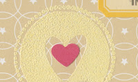 3. I like the idea of using tone on tone colours and so experimented with adding the circle stamp to the background paper (which was made up a pattern of similar circles). I stamped three of the images onto the edge of the page to create a visual triangle around the layout (bottom left, bottom right and top right) before embossing with Butter Zing powder. A tiny punched heart was added to the middle of one of them to further embellish it and also to create another triangle of punched hearts on the page, on this image, the jade tag and the yellow tag with the photo at the right hand side of the page.