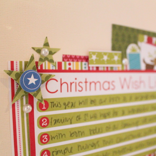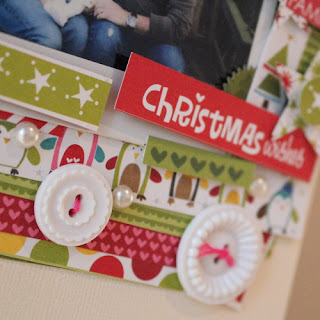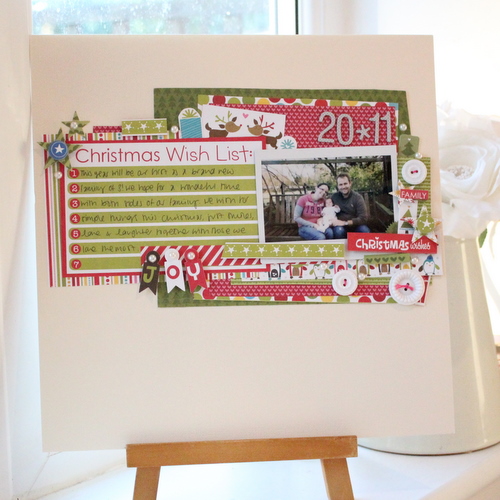 Another baby pic.. this one of her staring up at the Christmas tree lights. Layering is featured heavily in this layout too. The ‘borders’ paper from this collection proved to be a fab score of elements for this page, cut out Christmas trees and borders that I layered up with some punched out stars to create an embellishment cluster with stickers from the minatures sheet added in.