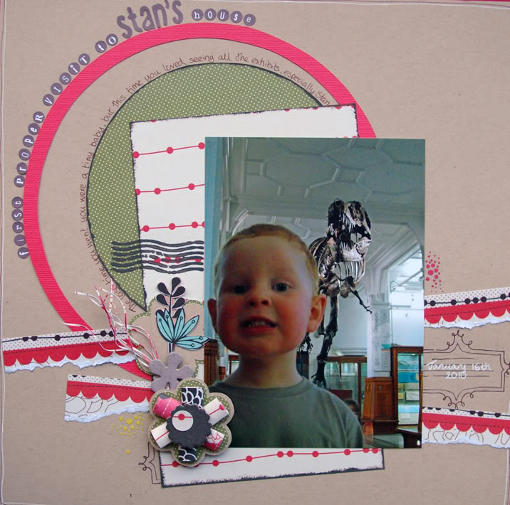 Lou, On this LO I wanted to keep it quite simple so opted for the Kraft card as a background. I used circles to lead the eye intothe photo, and tore the fancy edges of the paper to add as strips behind the photo. I used a 6 petal flower punch and added rolled bits of paper and a painted chipboard shape to create an embellishment and layered it with detail cut from the patterned paper and paper twirls. One rub on was split and added to the left and rigt of thephoto, and the alpha stickers were added around the outer circle, with hand journaling added to the inner circle.