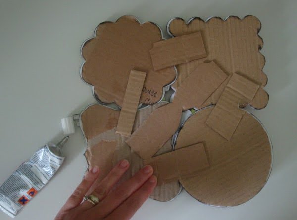 7. Arrange the four strengthened frames in front of you, but upside-down. Slightly overlap a few of the edges, and using strips of cardboard, glue them into position. Do NOT turn over until the glue is completely dried! Neatness is obviously not important here!