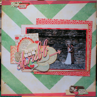 At this time of year many of the big papercrafting manufacturers release Valentine’s Day lines. Now I don’t know about you, but Valentine’s Day isn’t really a major event in our house. At most there’s the exchanging of cards and small gifts, and maybe a nice meal, but it’s certainly not a photo heavy day, nor one that requires multiple scrapbook pages in my albums.Most of the lines have one or two “Happy Valentine’s Day” or “February 14th” motifs, but other than that they are just pretty lines in gorgeous shades of red, pink & aqua – some of my favourite colours to scrap with! All the hearts and love themed icons make them perfect for scrapping weddings, which is exactly what I’ve done. What is nice about Valentine’s paper collections is that they often mix and match really well, because the motifs are similar, and the colours are often similar too. I’ve used: