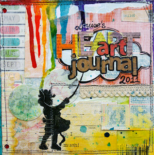 Firstly my front cover. I used scraps of random papers from past monthly kits and blog kits, to create a patchwork. Then painted over with watered down white acrylic paint. I knew as soon as I saw this cute Jenni Bowlin Whimsy stamp, it would have to be mine and it was perfect for the cover of my journal. I used a mix of alpha stickers including some from the cute Sassafrass range, for my title. I also used some crochet trim, clear embossing powder and a selection of mists to complete the page.