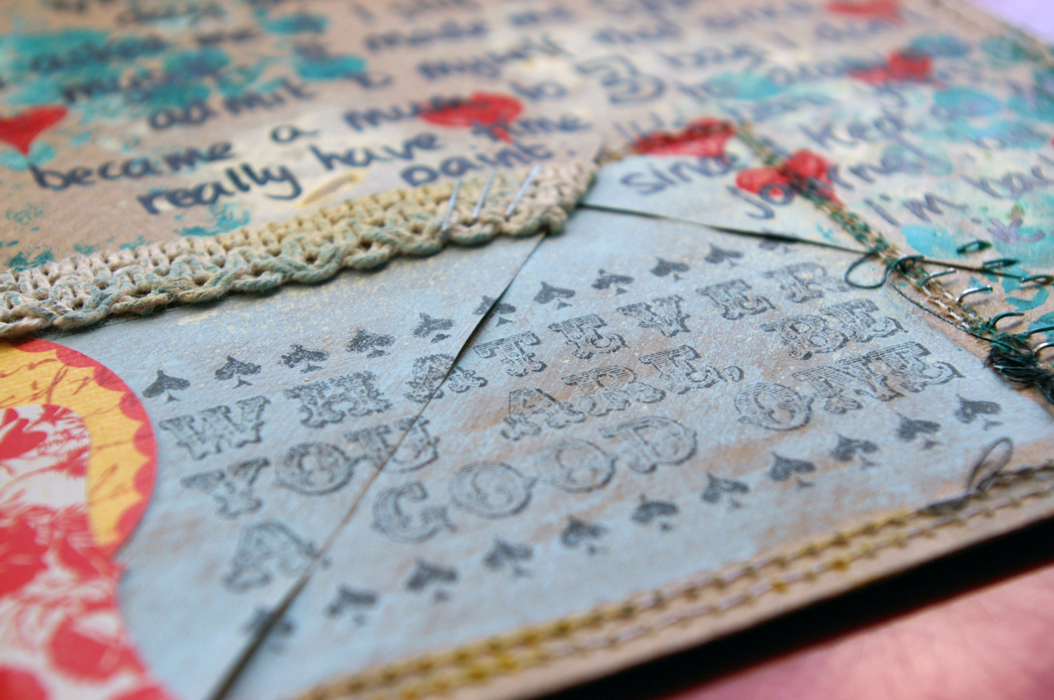 A lot of people think that Art Journals are pretentious and poncy. I had to keep them as part of my degree, so have grown to love the process. Even if you aren’t interested in creating a journal to keep on a regular basis, they are a fabulous way to experiment with media and new techniques. Quite a few people have said they’d like to have a go at using mists/resist/inks etc, and I bet most of those people have yet to try. It can be really daunting trying something completely new or something that is a huge leap away from your normal style… experimenting in an Art Journal, or sketch book or on scraps of paper held together by a book ring, can be the perfect way to play and mess, without the fear that you are going to ruin a LO or waste money messing up paper and card you really love. So why not have a go yourself… you might just love it, and it’s a great way to use up some of your left over kits.