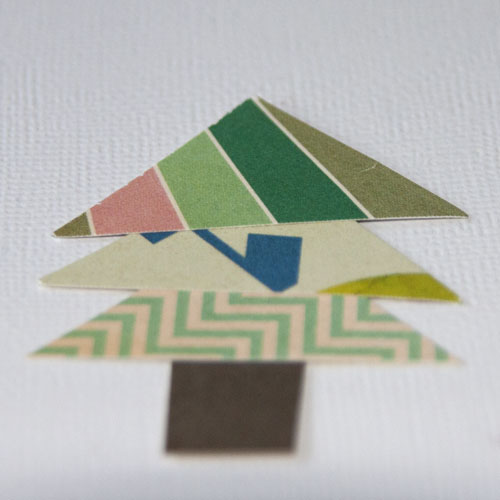 I made the trees by punching out 1 1/2″ squares…I used the little one from the twin Creative Memories Punch which I cut into 2 triangles. I stacked them up and added some brown paper for the trunk. I then lightly glue the pieces so it is easier to handle. I say lightly because I don’t want too much glue clogging up my sewing machine.