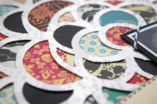 The first one is a great way to use up bits and pieces of patterned paper… let’s face it, we all have lots of paper scraps! After looking at the gorgeous quilts on Sarah’s blog, I have ordered a book on quilting from the book people that go to playgroup, but I got to thinking about creating a patchwork LO. After Googling some patchwork designs (how did we ever live without Google?) I really liked some of the complicated circular designs, and after thinking about how I could replicate the designs without too much blood, sweat and tears, I had a brainwave! I raided the kids colouring books cupboard and found some brilliant doodle books with fab designs. After choosing my favourite, I enlarged it to the size I wanted for my LO, and traced it onto my backing paper. I then cut out all the sections with a craft knife… a bit boring, but worth it in the end. I then simply filled each space with a piece of patterned paper or fabric, sticking into place with sellotape.