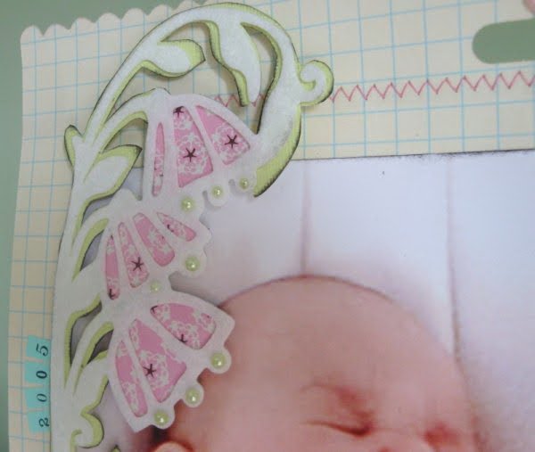 I loved the backing sheet from the pack of Lilybee Design Lovely Rub-ons, so I decided to use it as my layout base. I kept the design simple because I wanted to draw attention to the gorgeous voila felt lily orchid that I had decorated. On it’s own it would have not stood out against the pale cream background, so I drew around it onto green cardstock, making some of the leaves much bigger than they actually were, and the stems slightly thicker, and then cut it all out. I put pink patterned paper behind the flower petals. Once I had lightly inked the edges of the green cut-out, I stuck the felt flower down on top of it, and added pearls to the flowers for a little extra detail. A ribbon at the top of the page made a feature of the hanging tab, and decorative strips at the bottom covered the barcode and some wording. To finish it off all that was needed was a bit of journaling and some machine stitching. I added a section of the felt flower, decorated in the same way, beside the journaling and title to balance the page.