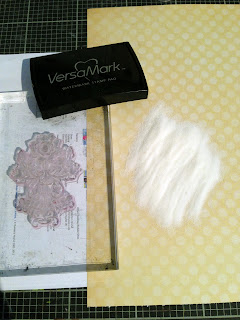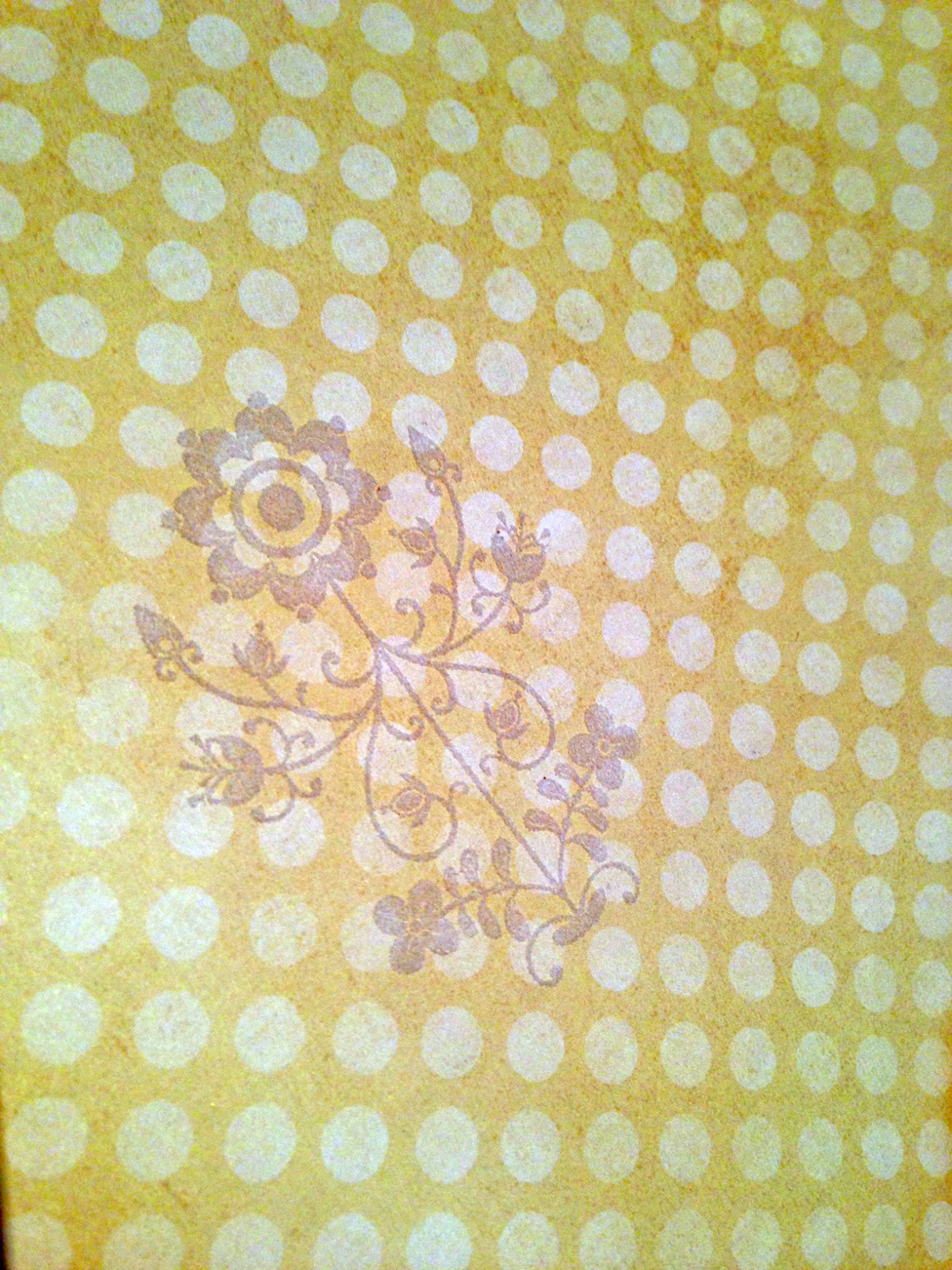 I chose the yellow spotty paper as my background and chose a couple of My Mind’s Eye stamps that I’ve had for a couple of years. Using versa-mark and clear embossing powder I added more detail to the paper.