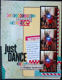 I had lots of photos taken of the children dancing along to Just Dance at New Year, but none of them were particularly good quality that they could be scrapped individually. I made 3 of the best into a film strip with a black border, which meant that they were small and so the picture quality was less important.