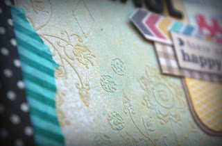 Once the embossing had cooled I gave the LO a very light spray of white mist and then teal. Wiping the residue from the embossed areas with a bit of kitchen towel.