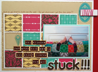 “I must have said it so many times, about so many paper ranges, but these papers were perfect for the photo of my lovely Ikea sofa! I decided to go with the patchwork style of the sofa and cut 2” squares distressing the edges slightly before mounting them onto a piece of white cardstock. I used kraft for the background because everything looks good on kraft! I used the back of one of the patterned papers to matt the tiny alphas on to and inked the edges in brown to make them stand out from the busy patterns of the papers. The photo of Drew stuck on the sofa was triple matted and I finished off the page by adding some puffy thickers for my title.”