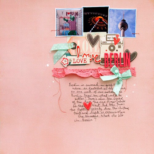Today I am going to share a couple of layouts from my visit to Berlin last Christmas. Don’t worry, they are not Christmas layouts but I am using Valentine’s range. I try not to get too pigeon-holed by colours ( my boys love pink, didn’t I tell you ? ) or specific icons such as heart. Ok, maybe Christmas baubles on non-christmassy layout will have you label me barmy! But I am not that bonkers, right ? Ok, let’s get a move on and let you be the judge.