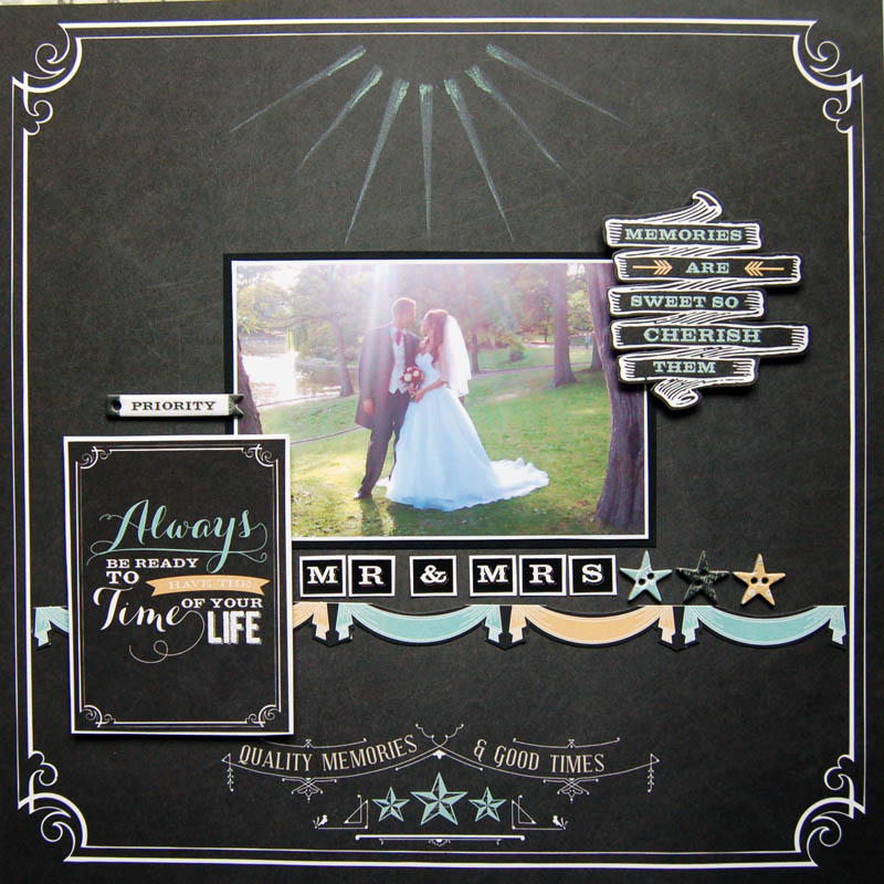 Sticking with the Teresa Collins memorabilia range I built up my layout around the painted bacground, choosing a photo of me and my other half from the aforementioned wedding!
