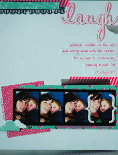 The first LO I have to share is of my 3 boys in their Christmas outfits, I created 3 patterned paper pillars and placed them in the same height order as the boys are in the photo. The stark white of the card was taken away with a light mist of teal, and a few splatters of pink lemonade.