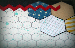 I misted the hexagonal Studio Calico paper with turquoise, using the a Studio Calico mask. I wanted to keep the patterned paper to a minimum on this LO so as not to distract from the gorgeous photo, so I hand cut some hexagons, and positioned them together in clusters.