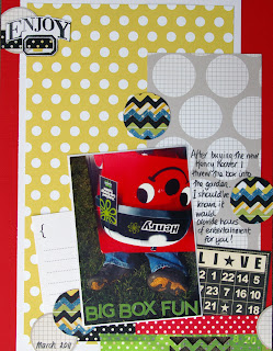 I have had this photo for over a year just waiting to be scrapped. I’ve scrapped about Drew’s obsession with hoovers before, so it will come as little surprise that he had a whale of a time playing with the box our real Henry Hoover came in.